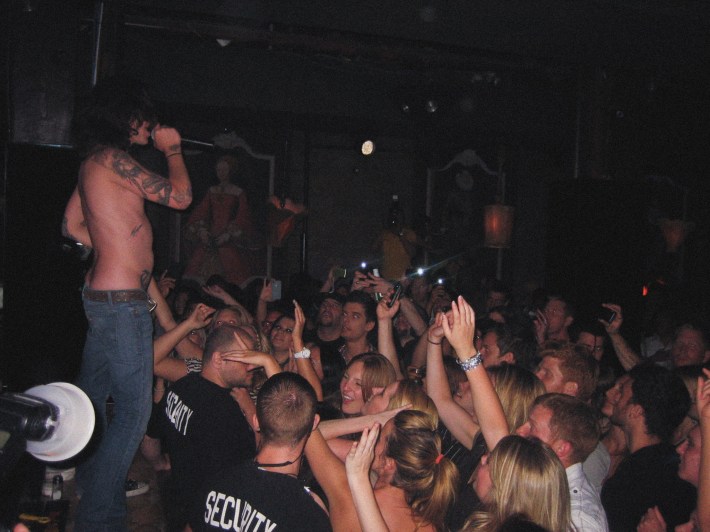 After a long-awaited appearance, Mickey Avalon made his way to Canada, stopping by a Thursday night party at Toronto’s Century Room. Crawling over the DJ booth onto a makeshift bar-stage and hanging onto the rafters, Mickey drawled over his own music as best he could, having traded musical substance for substance, in keeping with his perceived public image. The club regulars, after-workers, and sleaze lovers were overly receptive of Mickey Avalon’s less-than-impressive bar-crawling antics. Girls swooned and swarmed to present themselves at his side; “A lot of girls like to come to my show, so that’s good ’cause that gets the guys to the shows“. There were certainly more than a few lust-crazed eyes. They knew his lyrics when his conscious abandoned the mic.